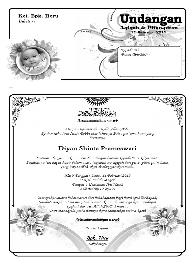 Dalam membuat undangan anda juga harus mencantumkan nama anda sebagai orang tua anak baik ayah maupun ibu. Ingin buat undangan aqiqah ini contohnya taufan punya blog download ingin buat undangan aqiqah ini contohnya taufan punya blog download format surat lain: 4 cara pembuatan kartu undangan aqiqah yang bisa anda lakukan. Silakan lakukan cara tersebut untuk membuka file kosong yang akan diisi dengan undangan aqiqah. Undangan aqiqah dan kartu ucapan aqiqah merupakan sebuah media yang berfungsi sebagai pemberitahuan atas acara tasyakuran aqiqah yang akan diselenggarakan.